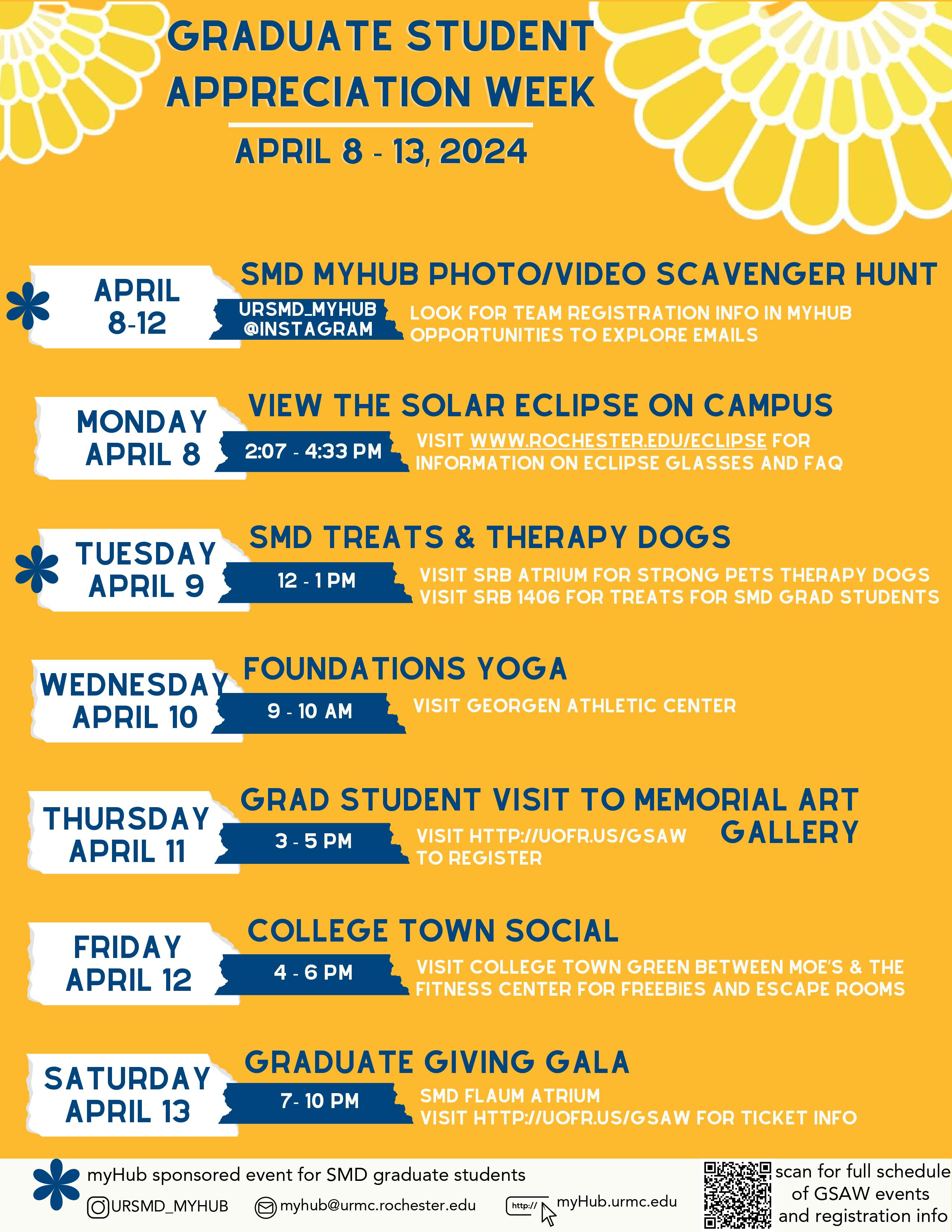 Graduate Student Appreciation Week starts April 8 and we invite you to end it with a BANG at the 2024 Graduate Giving Gala! Join GSA,GSS, GSOC, and SACNAS at 7 pm on April 13th in the Flaum Atrium for food, drinks, and dancing with music by DJ Dr. Griffs. Be sure to bring cash for the Gala Raffle which will feature gift baskets packed with enticing items from many local businesses! Proceeds from the Gala Raffle will be donated to Golisano Children’s Hospital & The Center for Youth.